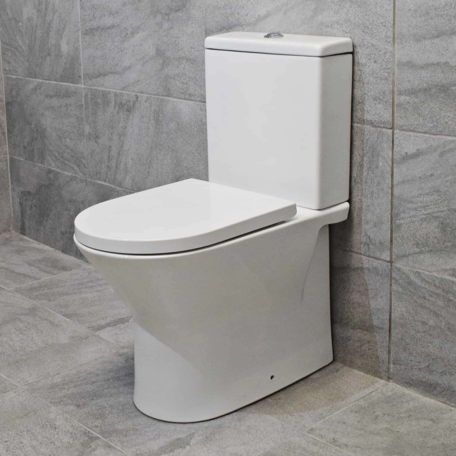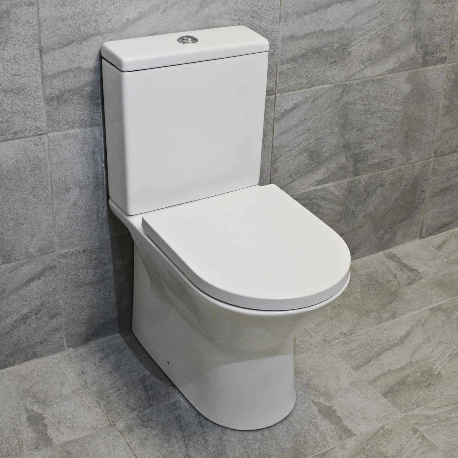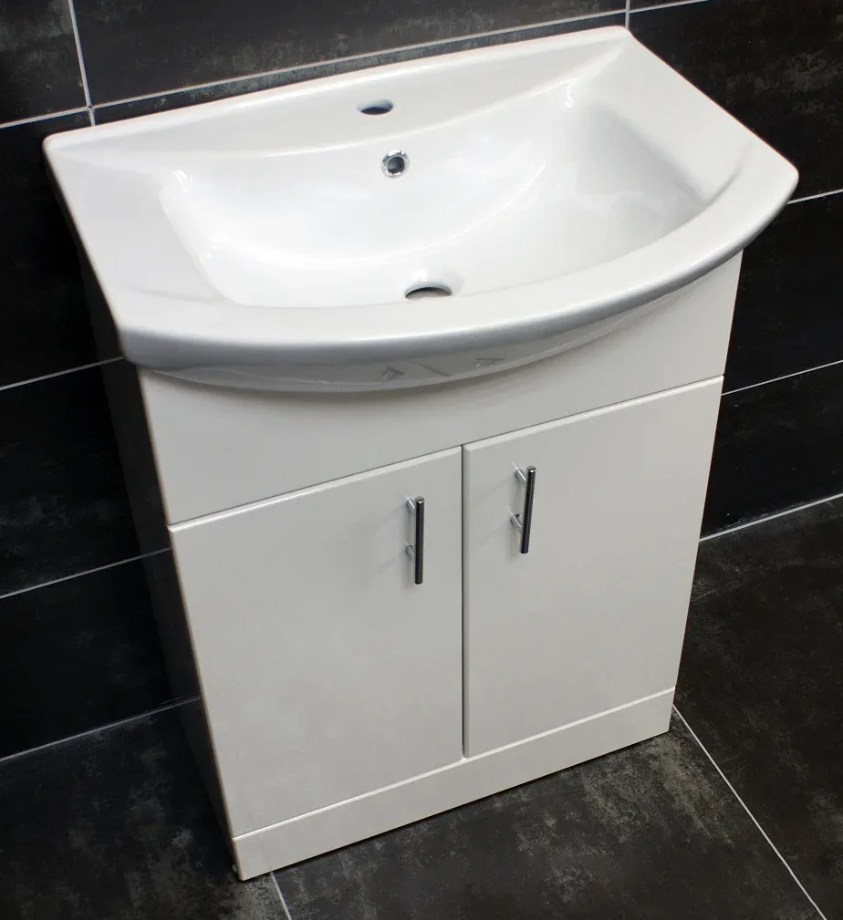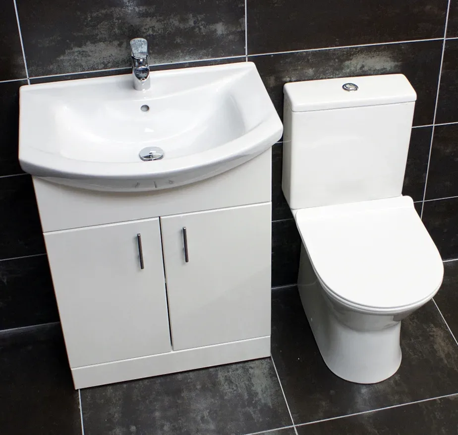 Stylish modern bathroom suite with a 650mm wide vanity basin with a choice of Rimless toilet