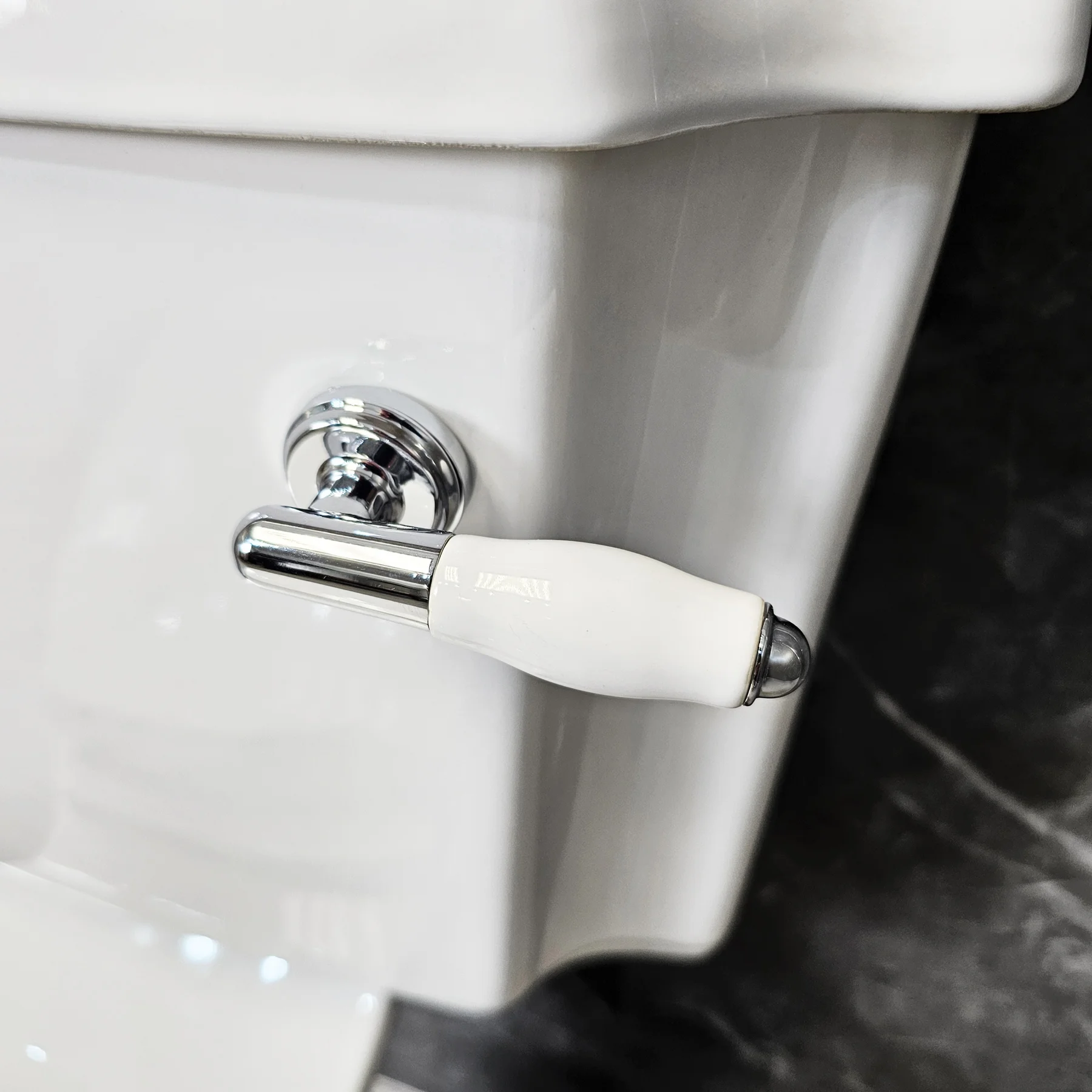 - With white and chrome traditional lever style flush